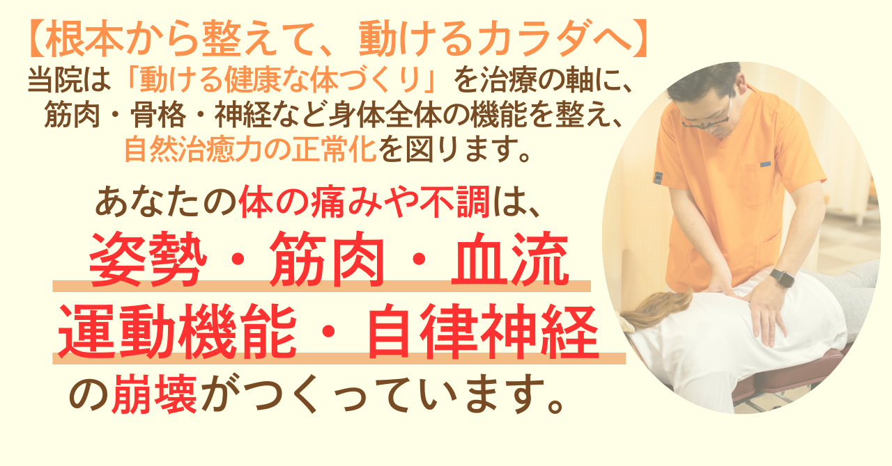 ホーム 2022.02.082025.05.22 腰を後ろに反ると痛い人の特徴とは? 2025.12.24 前かがみで腰が痛い人は、ここを伸ばそう! 2025.12.19 深呼吸で腰痛予防 2025.12.16 骨盤の位置を意識してみよう 2025.12.12 「国民病」とも言われる腰痛!その原因と改善のための簡単なセルフチェック 2025.12.10 もう「原因不明」で諦めない!あなたの腰痛を劇的に改善に導く【3つの新常識】 2025.11.14 もっとみる taiyou.miyoshi 三次駅すぐ近くの整骨鍼灸院たいよう 【根本から整えて、動けるカラダへ】 当院は「動ける健康な体づくり」を治療の軸に、 筋肉・骨格・神経など身体全体の機能を整え、自然治癒力の正常化を図ります。 根本から改善し、痛みの出にくいカラダを目指します。 あけましておめでとうございます🎍 本年も 整骨鍼灸院たいよう を よろしくお願いいたします。 今年も一年、 整骨鍼灸院たいように足を運んでくださり 本当にありがとうございました。 痛みや不 おはようございます。 新しい週が始まりました。 そして整骨鍼灸院たいようは、 本日で本年の診 【患者様の声💬】 ———————————— おくれた 腰を反らすと痛い 立っていると腰がつらい 仰向けで寝ると違和感がある そんな症状がある方、 原因は おはようございます 新しい週が始まりました。 今週は、クリスマス🎄という ビッグイベントがあり 前かがみになると腰が痛い… それ、腰だけが原因じゃないかもしれません。 実はこのタイプの腰痛、 太 腰痛予防というと ストレッチや筋トレを 思い浮かべる方が多いと思います。 でも実は、 「呼吸」 おはようございます。 新しい週が始まりました。 寒い日、「カイロ」が手放せないですね! カイロは さらに読み込む Instagram でフォロー
