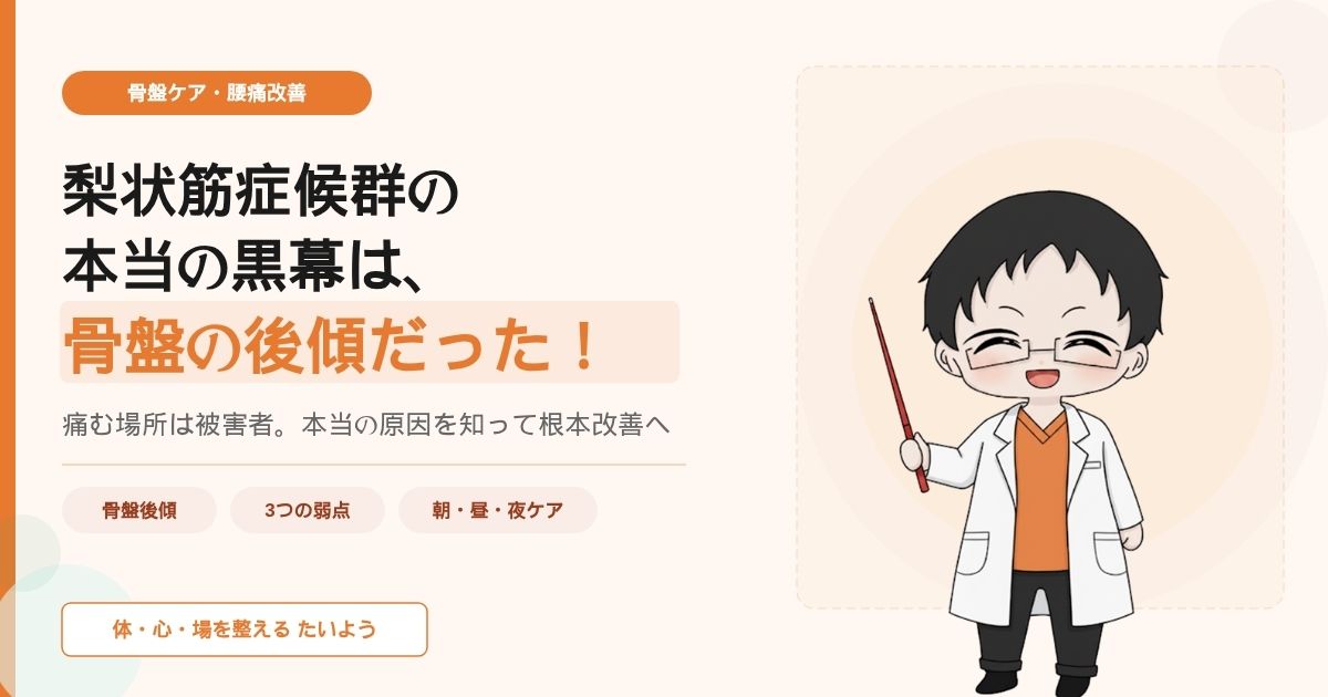 腰が痛い、お尻から足がしびれる……。腰痛や坐骨神経痛の原因はヘルニアや脊柱管狭窄症など様々ですが、「梨状筋症候群」と診断された方、もしくはそれに似た症状をお持ちの方に、ぜひ知っておいてほしいことがあります。痛みを感じている場所は、本当の犯人ではないかもしれません。